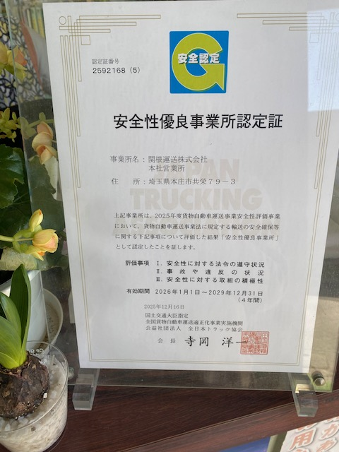 関根運送株式会社は、2025年度Gマーク認証を取得しました。